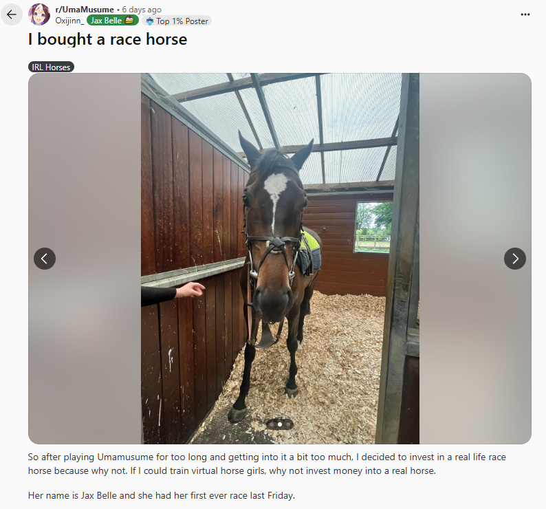 这个叫Oxijinn的reddit用户真的搞了一匹用于比赛的赛马。
