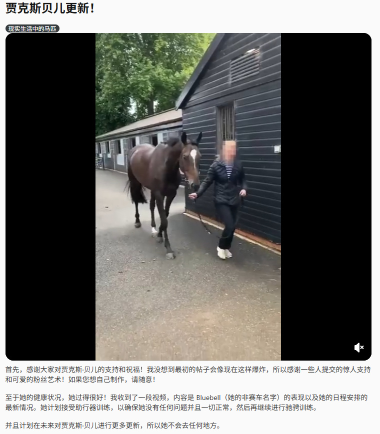 在最新的更新中,博主也是放出了一些新的后续,展示了贝儿在休息期间的日常和训练,并表示马的健康状况非常好,大伙不必太过担心。