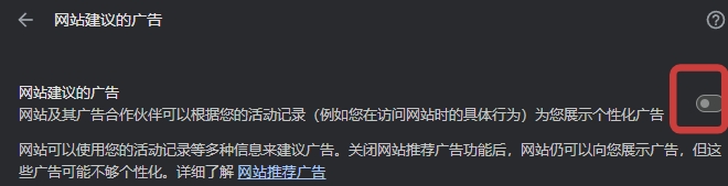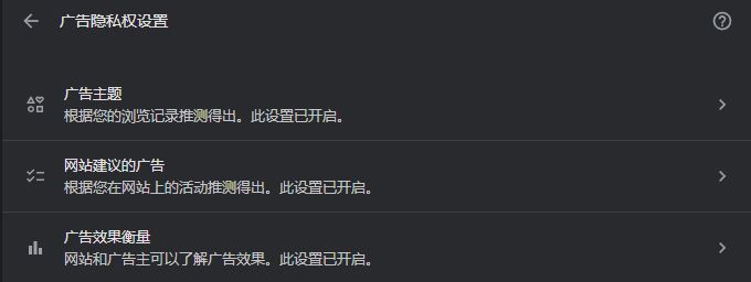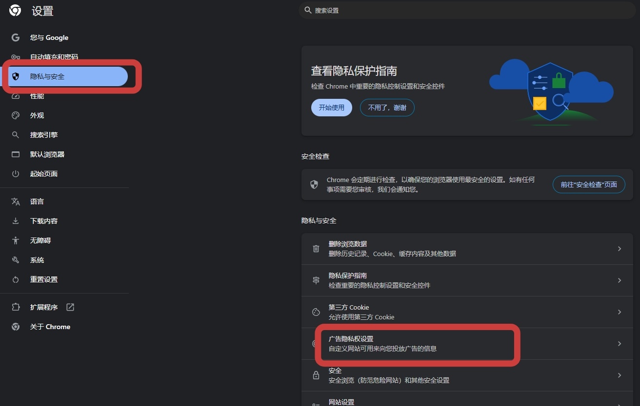 之后点击隐私与安全,进入广告隐私权设置,将广告主题,网站建议的广告,广告效果衡量全部关闭