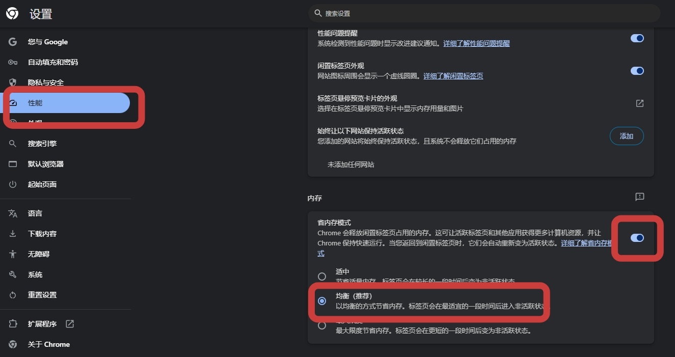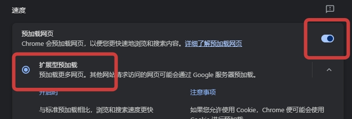在速度选项里将其改为扩展型预加载,这样你的浏览和搜索速度会更快