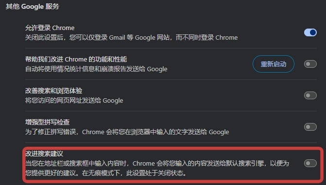 之后将同步功能和谷歌服务中的“改进搜索建议”关闭