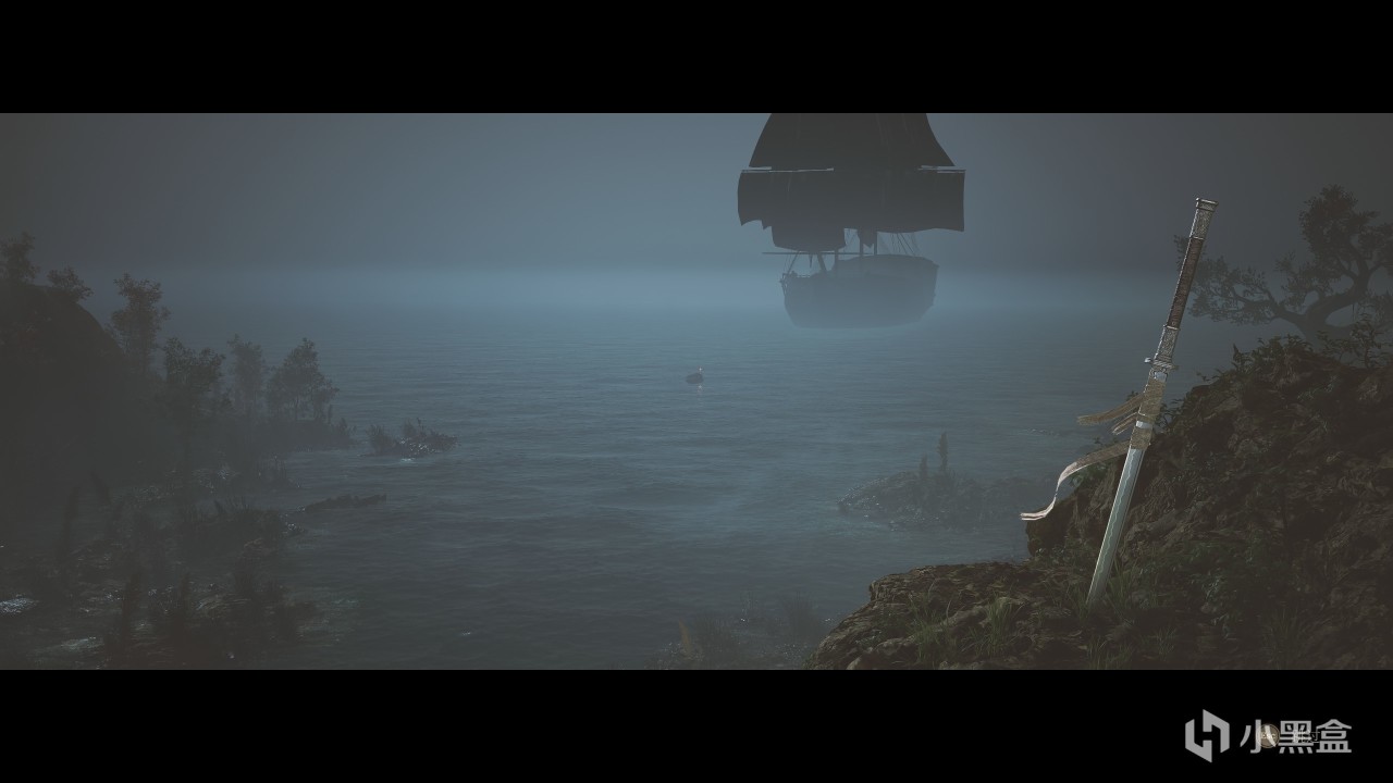 一葉孤舟駛過霧濛濛的江面,遠方是何有哉(海商)的商船。