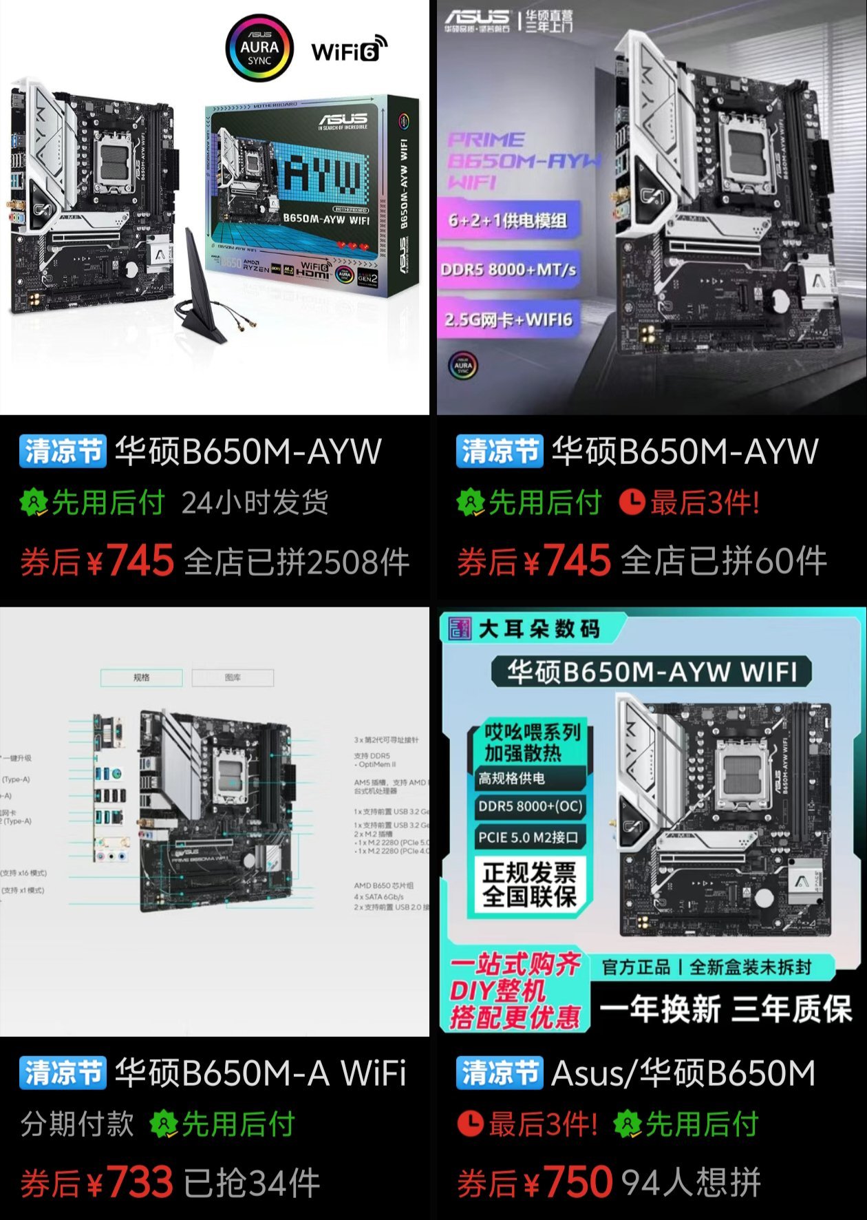 主板的話我選擇的是華碩的B650M AYW,整體的性價比和顏值都還是蠻高的,並且堆料也很足,剛好可以跑滿9600X,也比較適合內存條超頻,本身還自帶WIFI6,後面如果學校寬帶不能用,那剛好就用WIFI好了