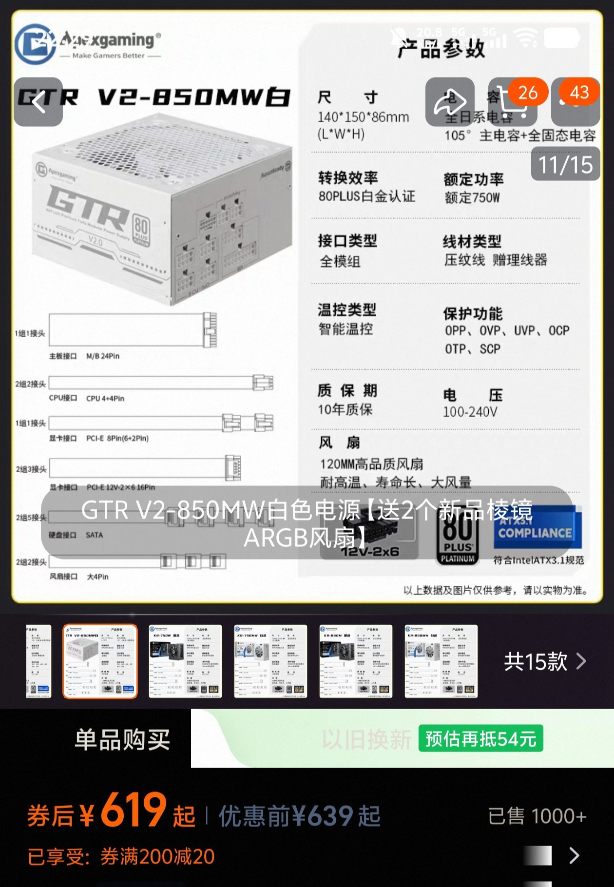 大家應該發現了,我電源選的是850W的,其實正常來說我這個配置650W綽綽有餘。但是我感覺我這回CPU選挺好的,一臺電腦大幾千大家肯定捨不得用兩三年就換,後面如果覺得配置不夠了,想換顯卡了,到時候功率一大,也不需要換電源。當然還得看大家自己想法嘛 要是以後不想升級,買艾湃那個650W就行了