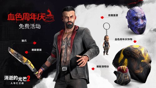 在週年慶期間,我們可以參加血色週年慶活動(1/31 - 02/09)和 飛身踢週末 (02/08 - 02/13) 主題活動中,通過完成社區目標獲得好禮,將能免費獲得賴斯捆綁包(零售價 15 元)和佈雷肯捆綁包(零售價 15 元)。在2023年,Techland將先後更新跨世代聯機、合作模式下的動態競賽、STEAM DECK支持、戰鬥物理引擎升級、TGG任務裝備幻化系統、夜間體驗和遊蕩夜魔、跑酷流升級以及第二個DLC(全新故事擴展包、新區域、新武器類型)