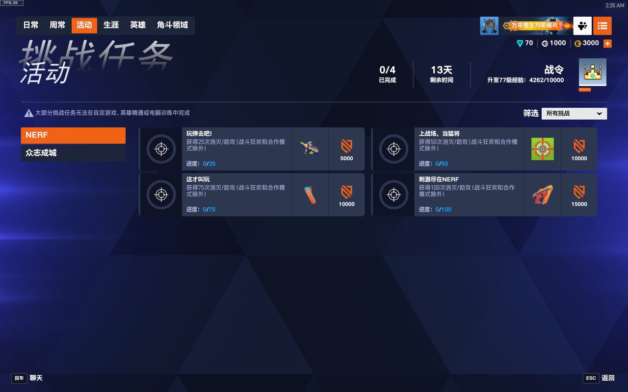刺激盡在NERF是快節奏大亂鬥模式,8名玩家自由混戰,率先完成20次消滅者勝出。在遊戲開局,你將隨機使用一位英雄(不包含旁觀的“天使”與“生命之梭”),每次消滅都會切換一位新英雄。部分英雄會帶着NERF聯動發射器皮膚登場,讓你在實戰中精通新武器。消滅不掉敵人怎麼辦?連續陣亡3次也將自動切換英雄,模式中不會出現重複英雄。在一局遊戲裏,每個英雄都只能被一名玩家使用一次。