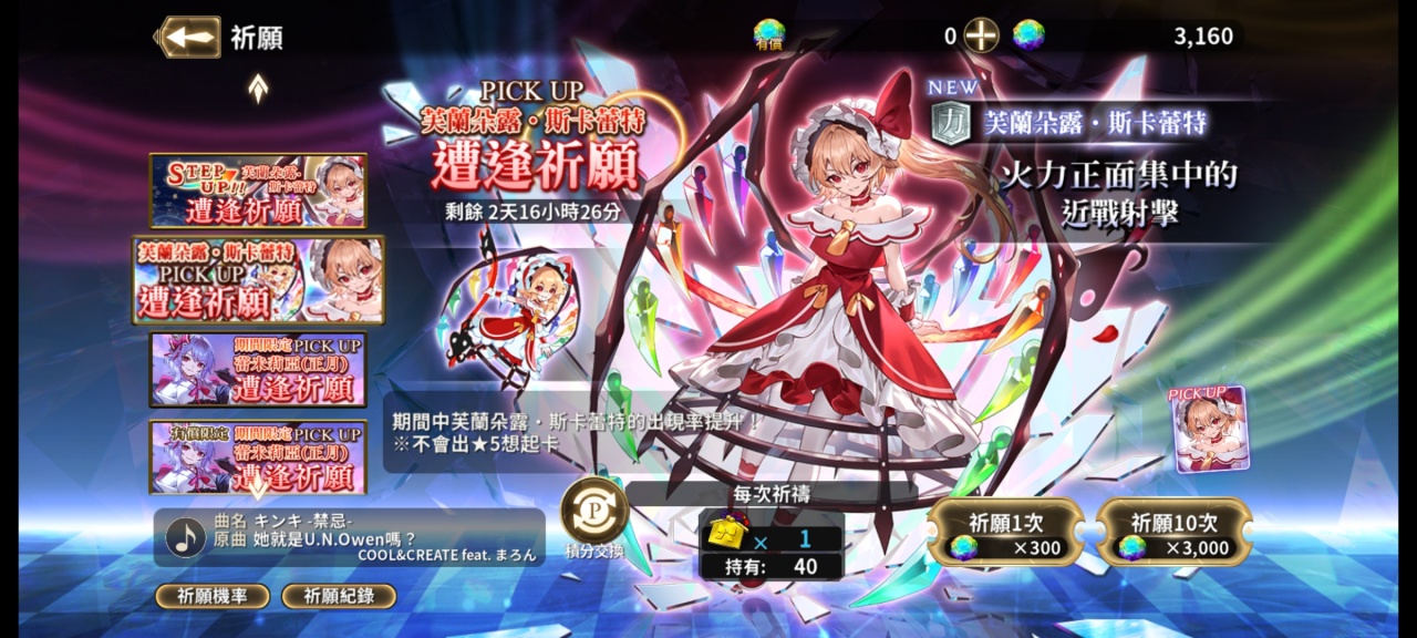 說了那麼多養成內容,二次元遊戲養成的核心之一無非就是抽卡。那麼,經過繁中服幾天的公測後,整體的運營福利和爆率究竟如何呢?開服福利方面:登錄遊戲即可獲得9000晶石(相當於30連抽)、金色扭蛋券×10,以及兩位人氣角色——琪露諾和靈夢。