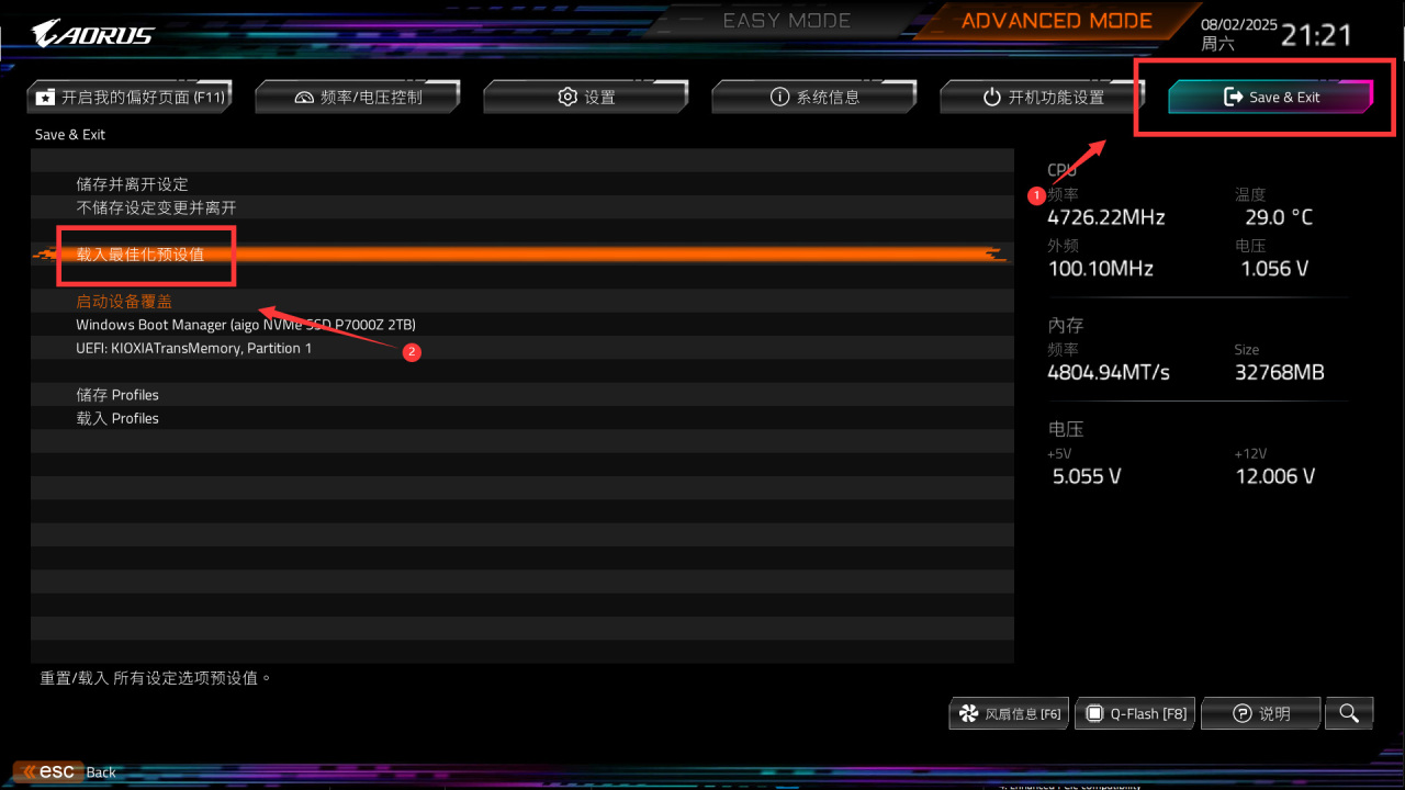 升级完成后多做一步,重启重新进入BIOS的Save&Exit页面,点击载入最佳化预设值,也就是重置下BIOS,关机状态长按CLR CMOS键一分钟效果也是一样的。