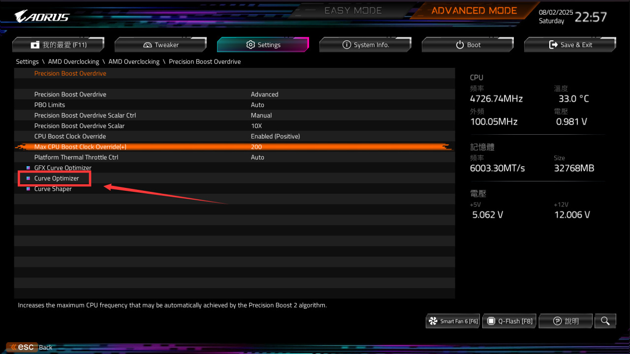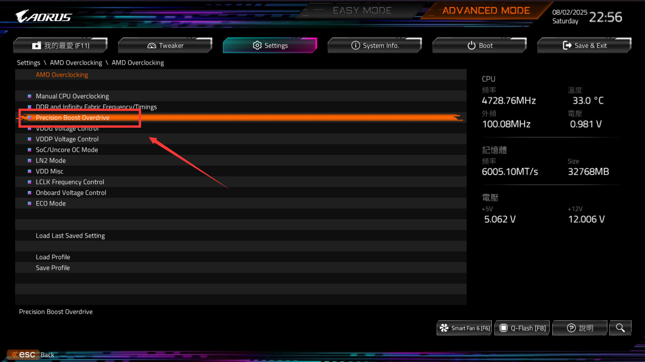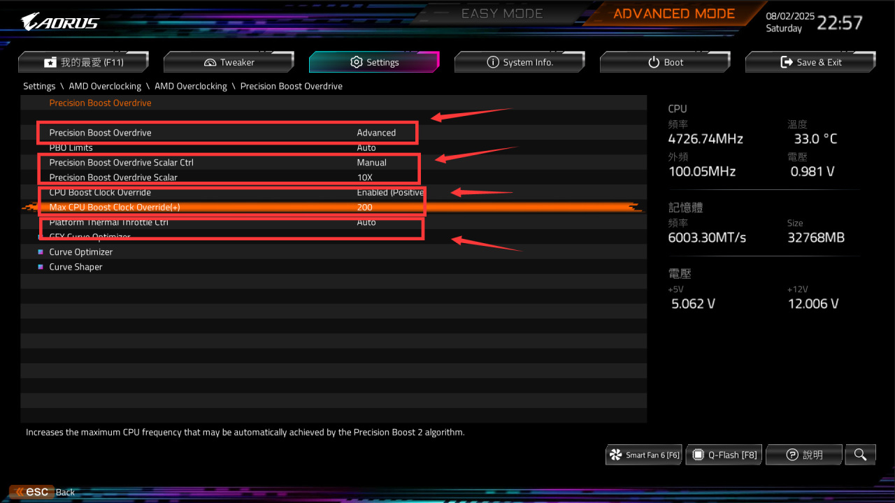 进入下一级页面后,点击Precision Boost Override,将模式从默认的Auto切换成Advanced,切换后会显示详细设置项目,按照下图说明操作: