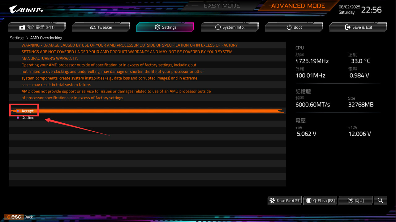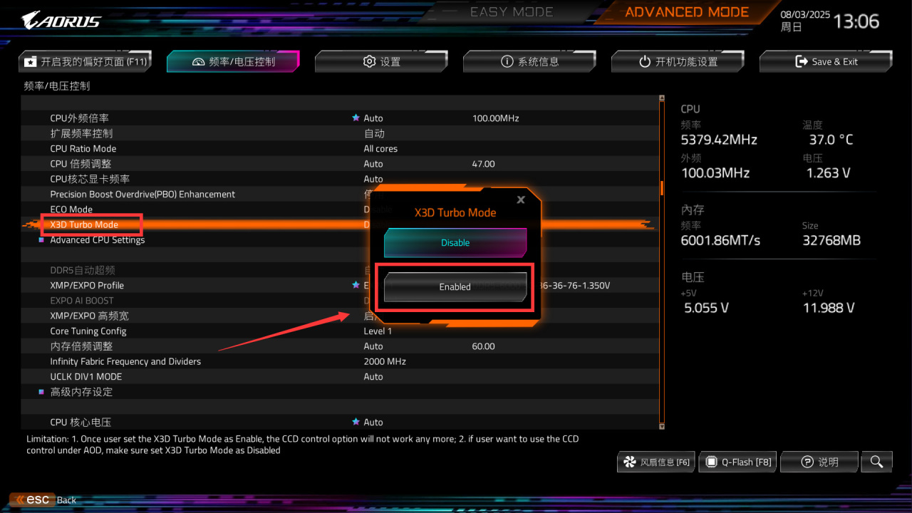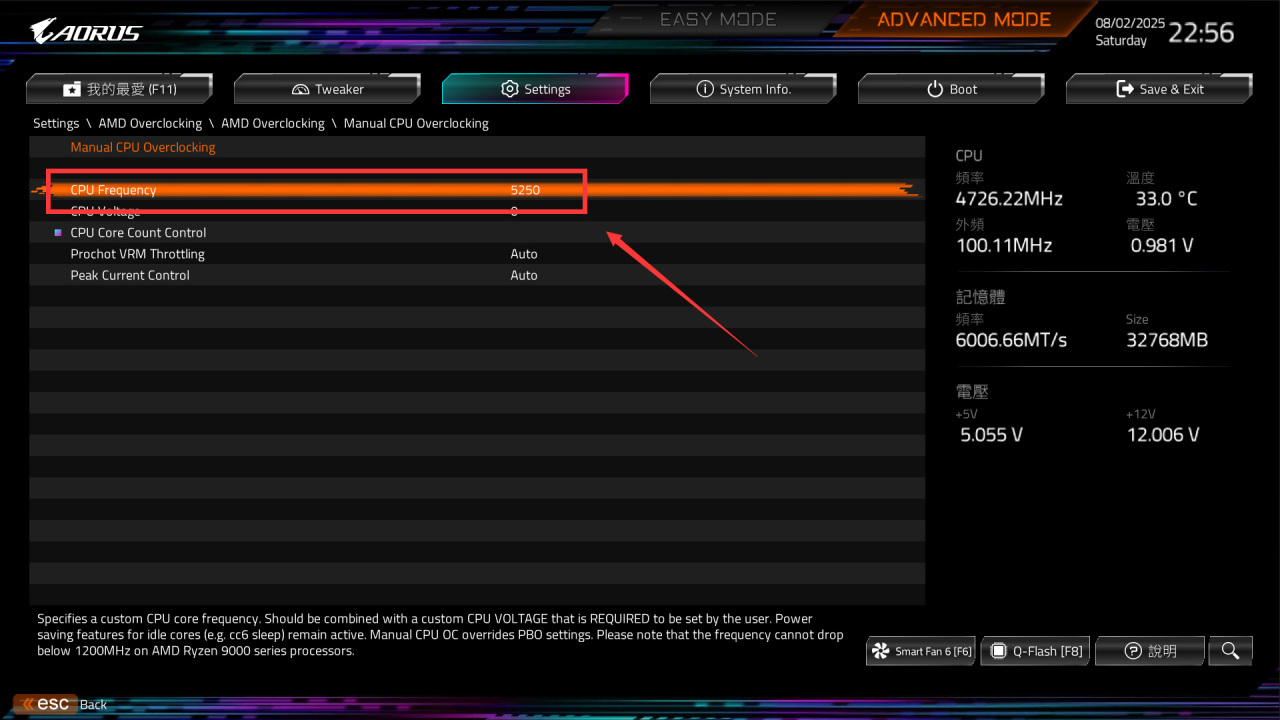 ● 如果你的CPU体质非常好,可以尝试超频填写5400(5.4GHz),这个数据也是一般零售9800X3D的极限数据。