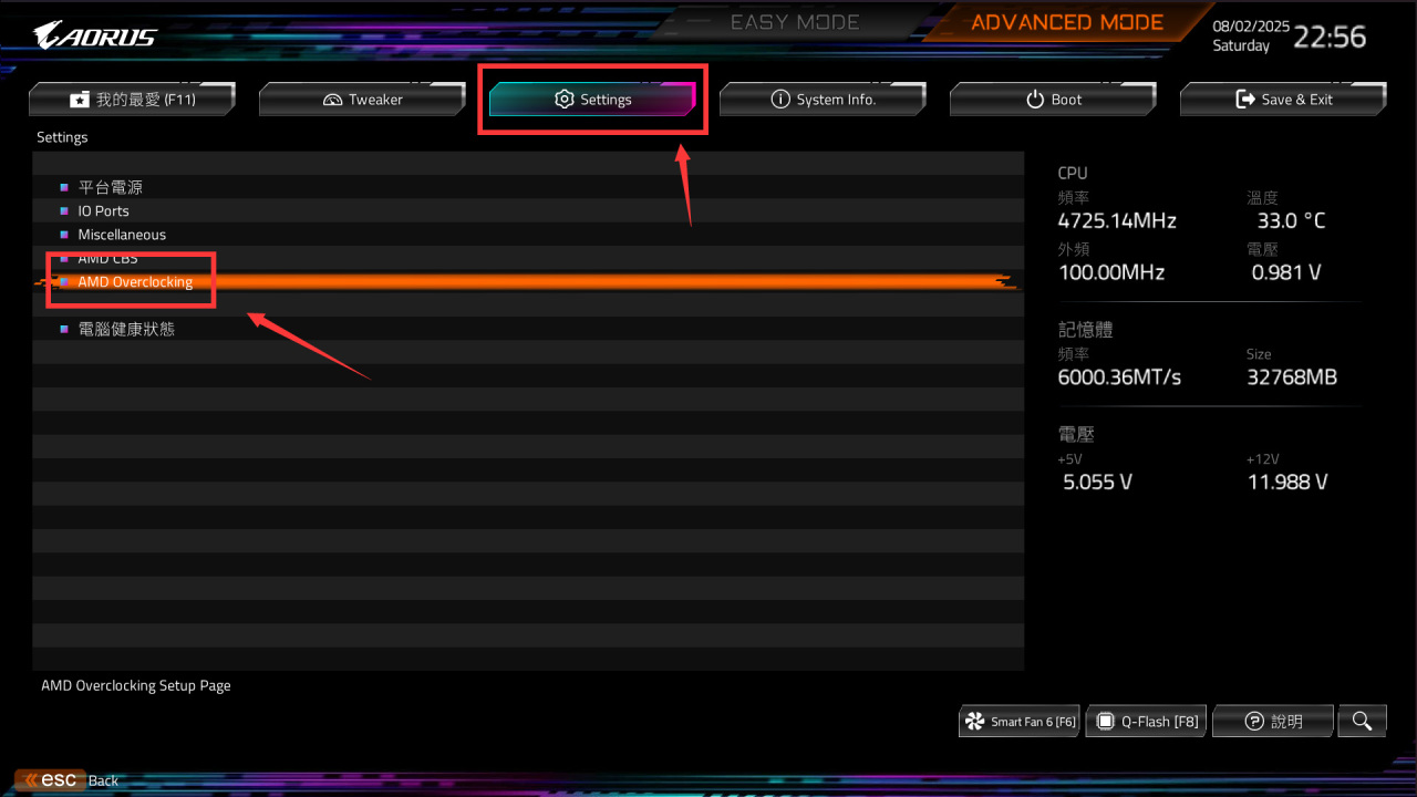 冲击极限需要使用PBO2超频,按照下图所示,切换成高级模式,进入设置页面下的AMD Overclocking。