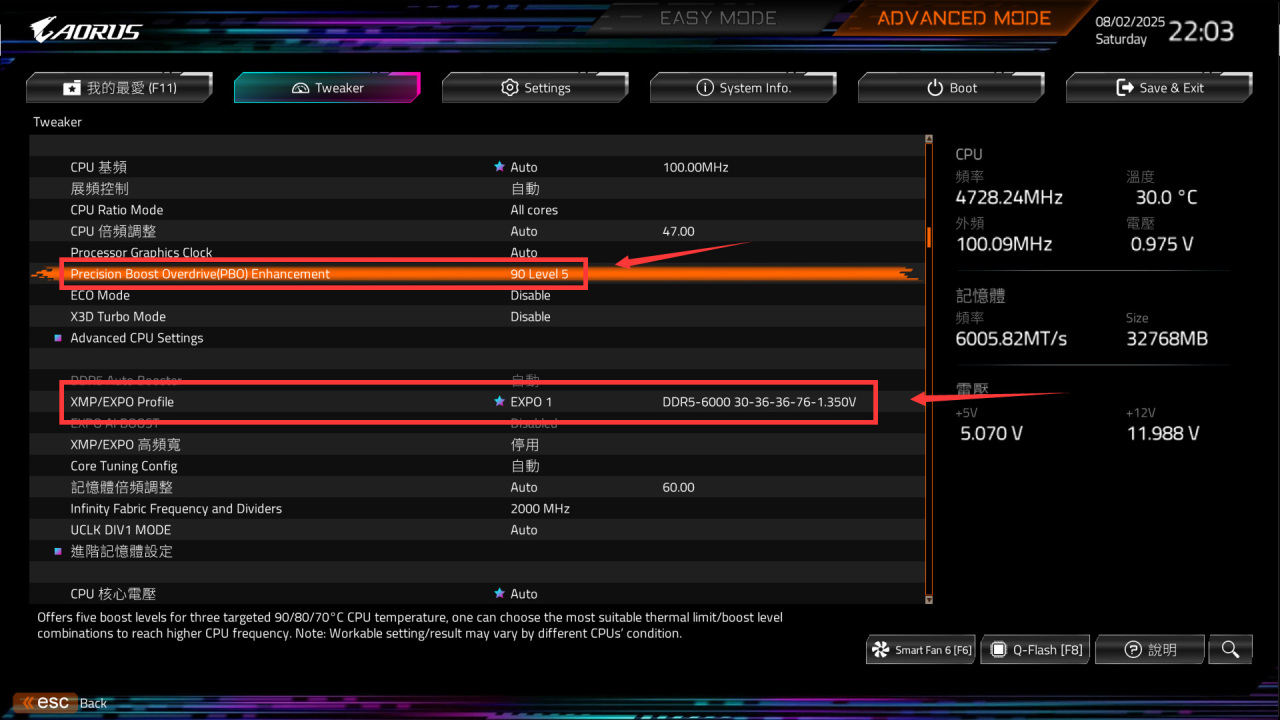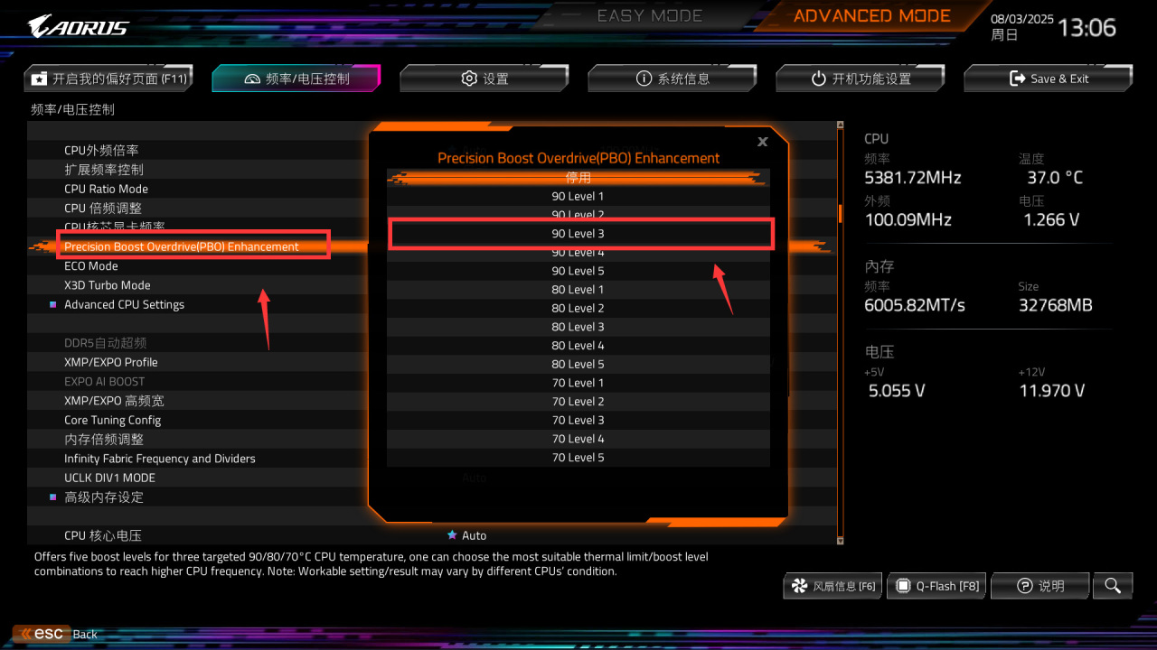 ● PBO Enhancement,也就是PBO1,一般建议90 Level3,CPU体质比较好可以尝试切换成90 Level5。