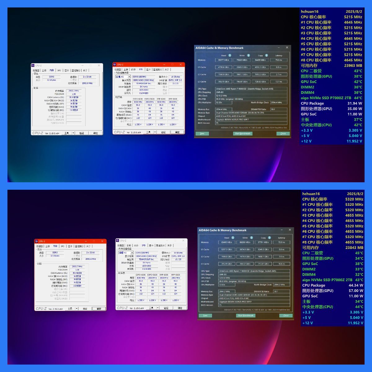 单独说一下高频内存,不是不能超,而是AMD平台超高频确实没啥意义,过了6400MHz只能用分频模式,下图8000MHz的效能还不如开了技嘉优化的6000MHz,知道该怎么选了吧。