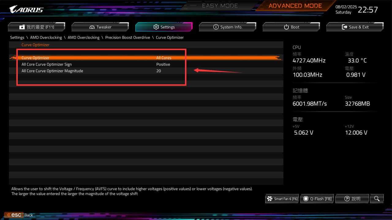 ● All Cores Curve Optimizer Magnitude正常填写20,这里是降压20,也就是降低CPU工作电压+降低运行温度。