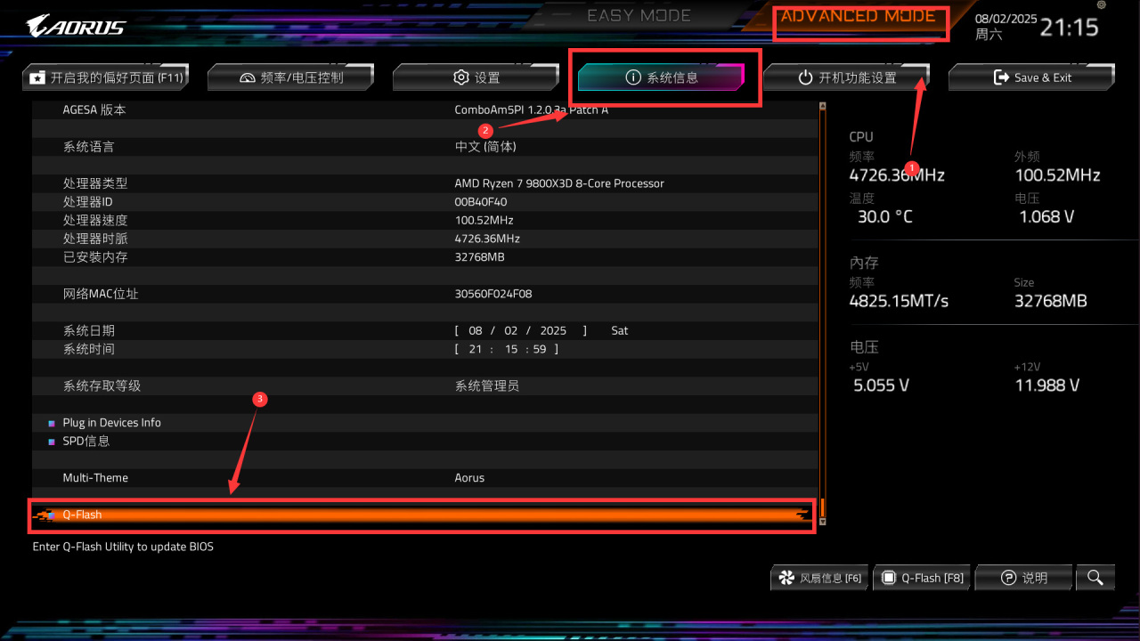 准备工作做完后将U盘接入主板,开机按Del键进入BIOS,按F2切换到高级模式,进入系统信息页面,回车进入Q-Flash功能,按提示选择BIOS固件就行。