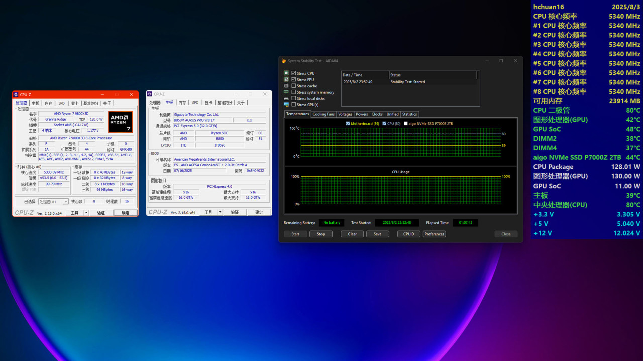 得益于出色的散热件用料和开槽设计,技嘉B850M电竞雕本身的温控确实不错,使用紧凑型机箱也不会有散热压力,放心上高配CPU+显卡吧。