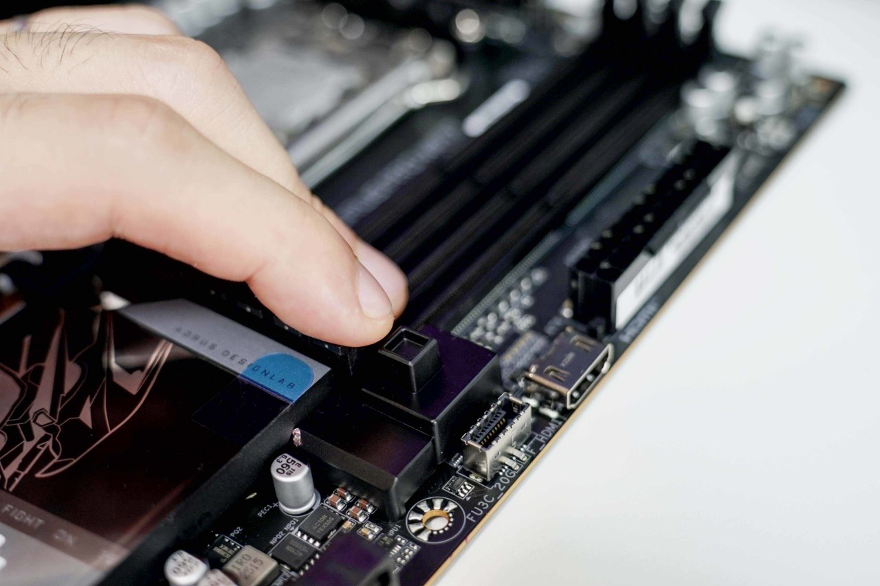 拆解显卡按下内存槽右下的按钮即可解锁,和我一样的大手用户不用再拿螺丝刀捣,也是目前中高端主板的标配设计,这点御三家都差不多。