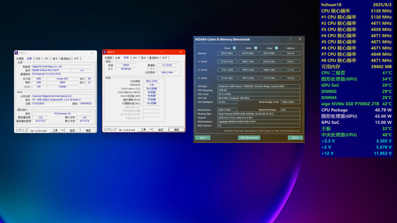 ● CPU Frequency对应CPU频率,AMD官方给9800X3D定义的最大加速频率是5.2GHz。