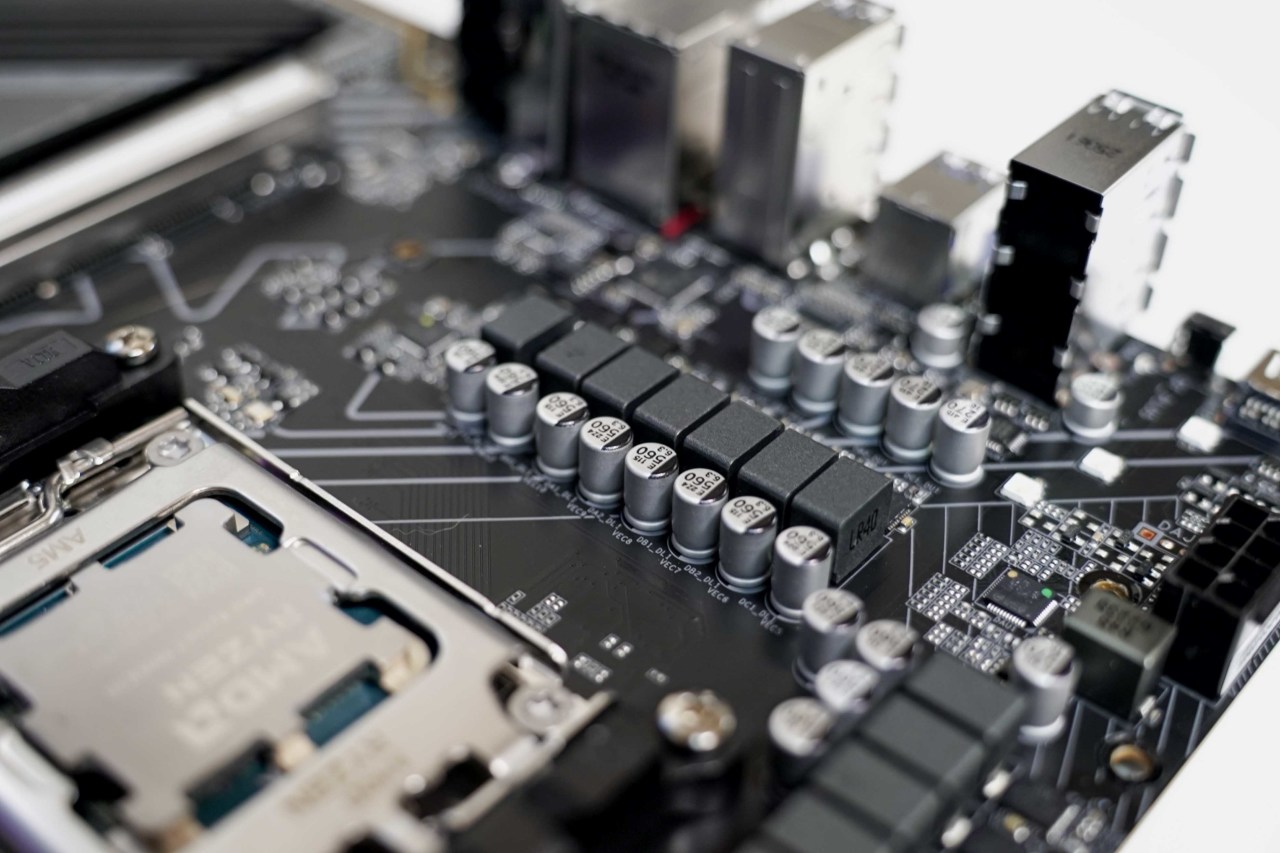 下面看下关键元件,技嘉B850M电竞雕使用8层低损耗PCB,供电为12+2+2的次旗舰配置,搭配优质电感电容,带次旗舰CPU肯定是没问题的,下面有测试。