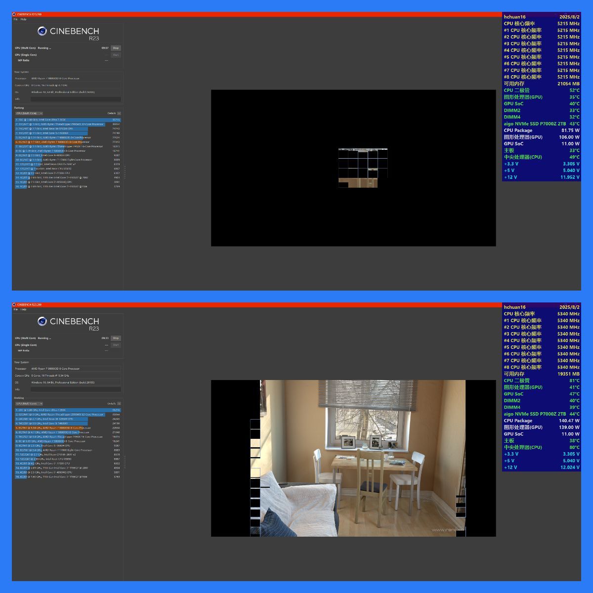 ● 常规简化调试的峰值频率为5215MHz,CPU功耗为80W左右。
