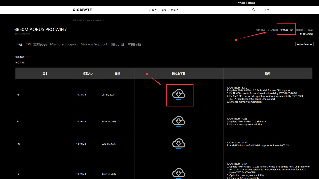 不管是哪种调试,到手一定要先更新BIOS,准备个U盘,去技嘉官网搜索你的主板型号,去支持与下载中,下载BIOS固件并解压缩到U盘上。