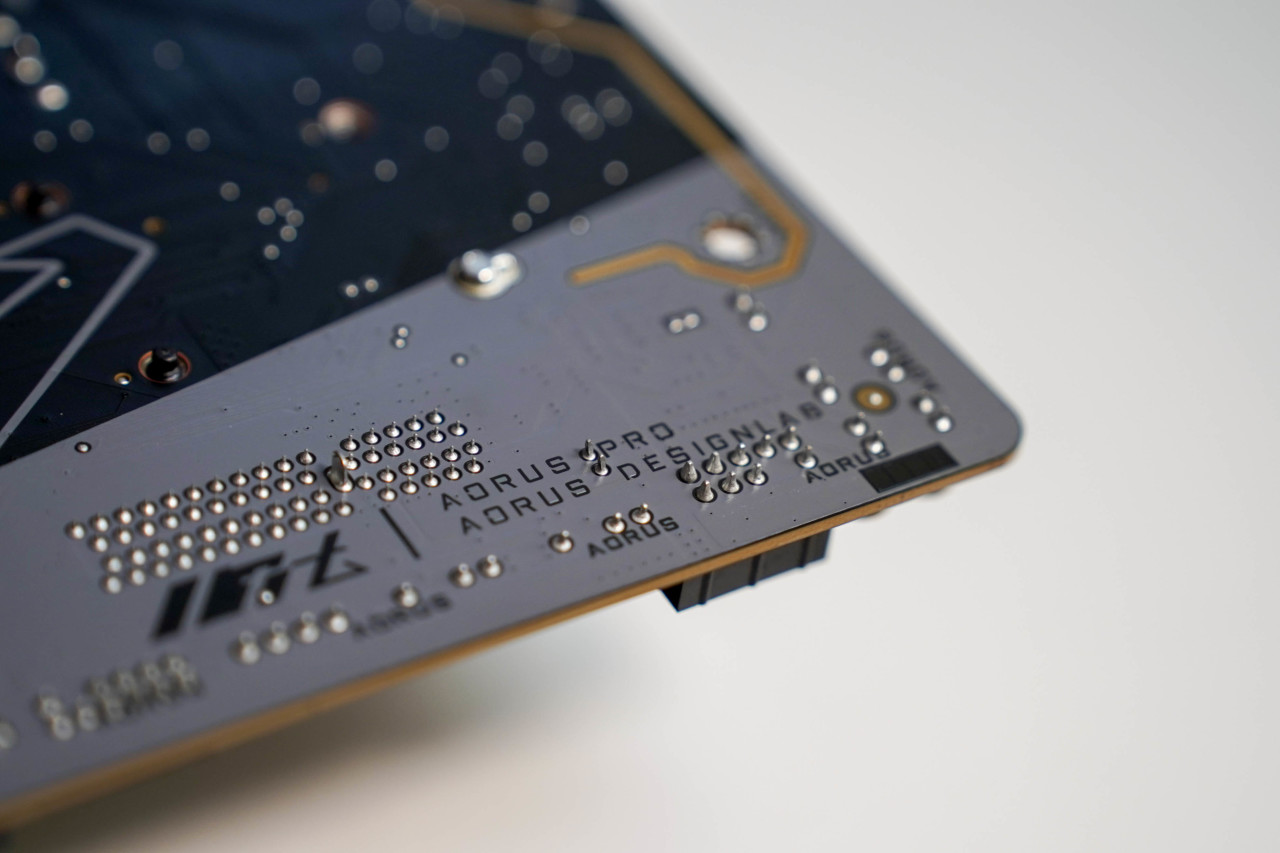 这代技嘉主板都改用了这种一体式马甲,,导热槽开的也非常多,MOS对应位置都贴有高导热系数的导热垫,这些是主板运行温度低的原因所在。