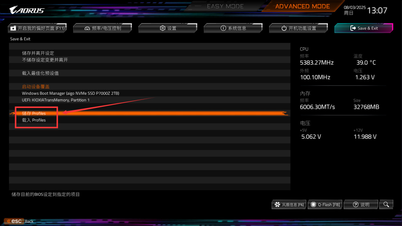 后续如果遇到死机或者主板电池没电等问题导致的BIOS配置失效,进到这个页面点击载入Profile即可快速恢复BIOS设置。