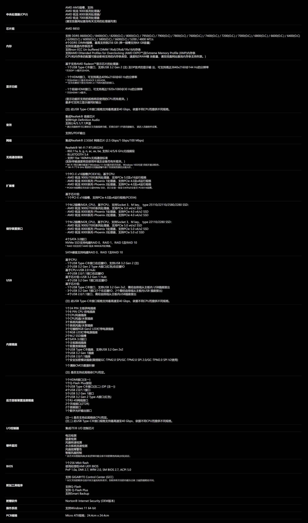老样子,列一下技嘉B850M电竞雕的基础硬件参数: