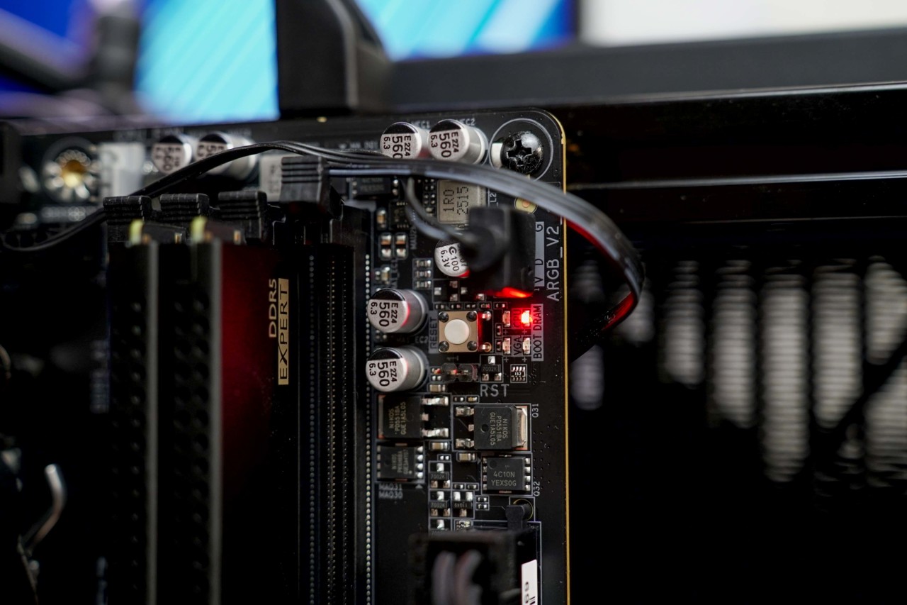 如果和下图一样乱插内存,Debug会亮灯提示,对装机新手来说是很实用的设计,也是其他两家没有的提示机制。