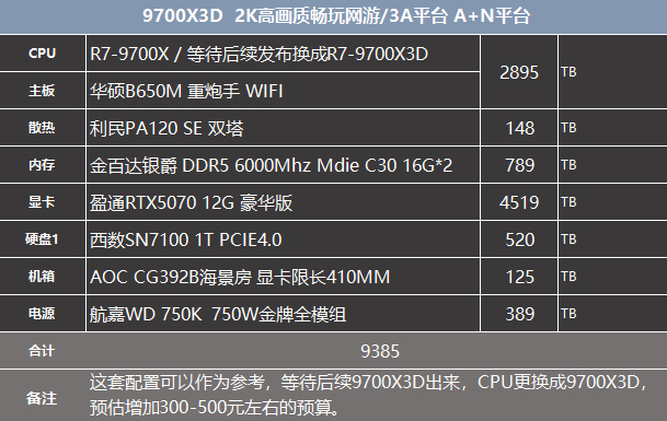 這套AU+N卡。用作參考,R7 - 9700X(可換成 9700X3D )搭配華碩 B650M 重炮手主板,加上RTX5070顯卡應對 2K 網遊、3A 遊戲用,加上DLSS4的超分和拼好幀技術,4K入門畫質也可以玩玩,若後續 CPU 換成9700X3D,能進一步提升對網遊表現。