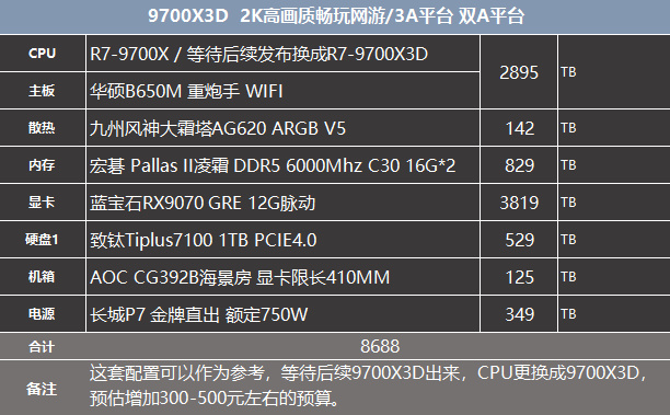 同樣圍繞9700X系列CPU搭配(可換成 9700X3D ),搭配個9070GRE,AU+A卡,雙A平臺,雖然說FSR4支持的遊戲不多,但是AMD一直在更新驅動,最近FSR4又支持了不少遊戲,A卡戰未來,同樣的,後續CPU換成9700X3D,能進一步提升對網遊表現。
