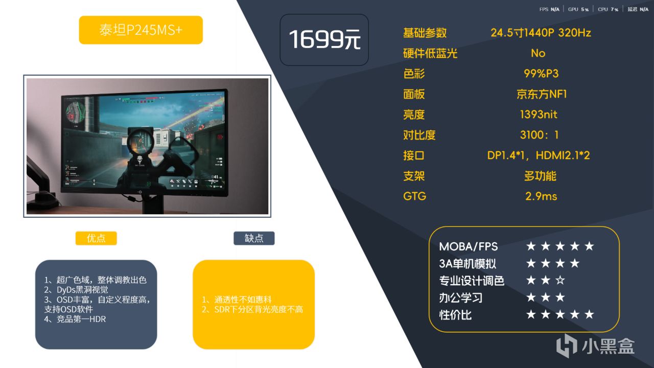 那麼泰坦軍團的P245MS+,就是目前24寸小屏第一HDR顯示器了。即使京東方面板的通透性不如惠科,但是1152分區背光加上泰坦不錯的背光調教,P245MS+的觀感已經很不錯了。出色的色彩和背光,讓他的應用範圍是比較廣的。2.9msGTG響應時間,OD調的是很不錯的,滿足FPS用戶需求,HDR競品第一,沒什麼好說的。隨着DYDS黑洞視覺,以及OSD軟件的出現,算是極大補強了功能支持