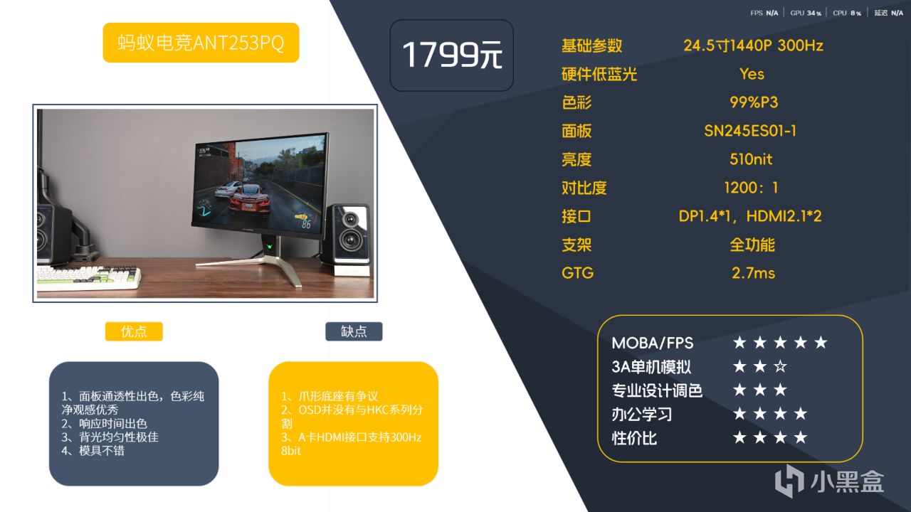 目前在售的幾款產品中,我最推薦仍然是螞蟻電競ANT253PQ以及泰坦軍團P245MS+。作爲惠科定位電競的高端品牌,他採用的惠科自家面板,擁有非常不錯的通透性表現。高達99%的P3廣色域以及不錯的色彩調教,擁有非常不錯的畫面表現。2.9ms的響應時間,結合特調的背光均勻性,整體觀感非常出色。這臺機器確實可以說一分錢一分貨,背光表現力可以說領先競品至少2檔,模具和支架體驗也非常不錯。