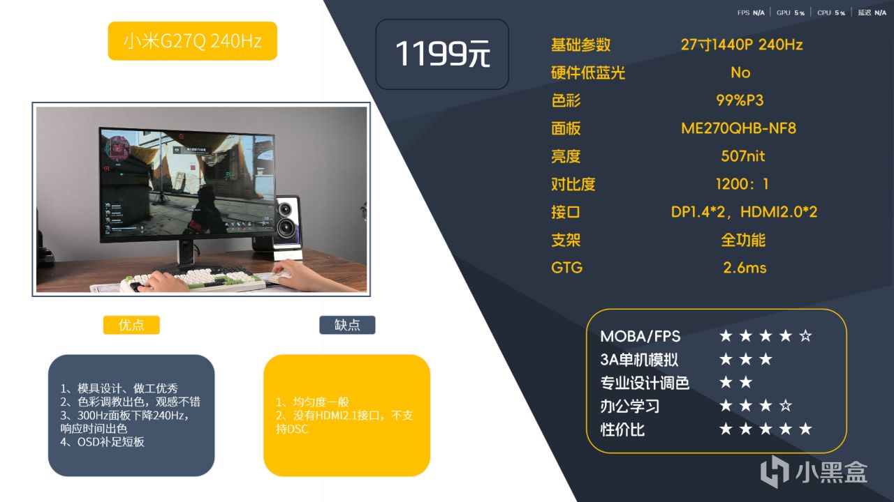 那麼到240Hz的產品, 這裏就推薦一臺機器,小米G27Q 240hz版本,這是目前我測到的第一臺,用300Hz的面板,做出240Hz產品的機器。好處就是帶來了更快的響應速度,它的GTG響應時間也能達到2.6ms,表現可以說非常出色。小米的宣發團隊卻根本沒提這件事