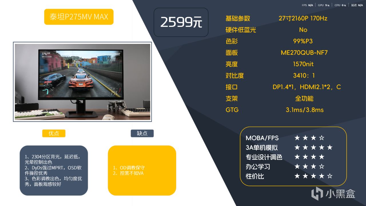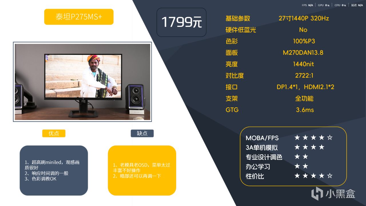 那麼雙模4Kminiled顯示器的推薦,8月有兩臺機器,第一臺來自泰坦軍團P275MV MAX,泰坦軍團應該是業界做miniled顯示器最多的品牌了,這臺機器完全展現了IPS MINILED的潛力,2304分區背光和優秀的控光算法,他的光暈控制相當出色,正常用戶已經很難分辨光暈。作爲miniled顯示器痛點的背光延遲,這臺機器也基本完全克服,就是可惜對應的響應時間上,泰坦沒有調好,否則這臺機器就能做到絕大多數類型遊戲全包圍的恐怖表現了。
