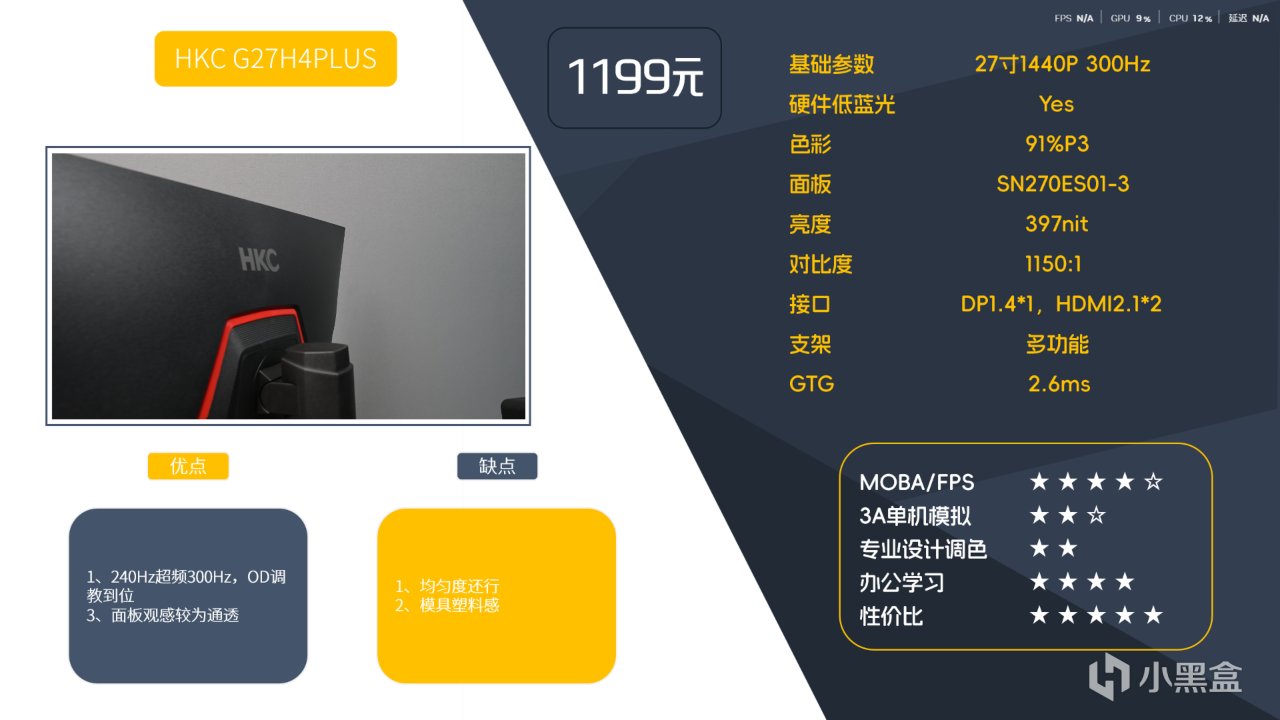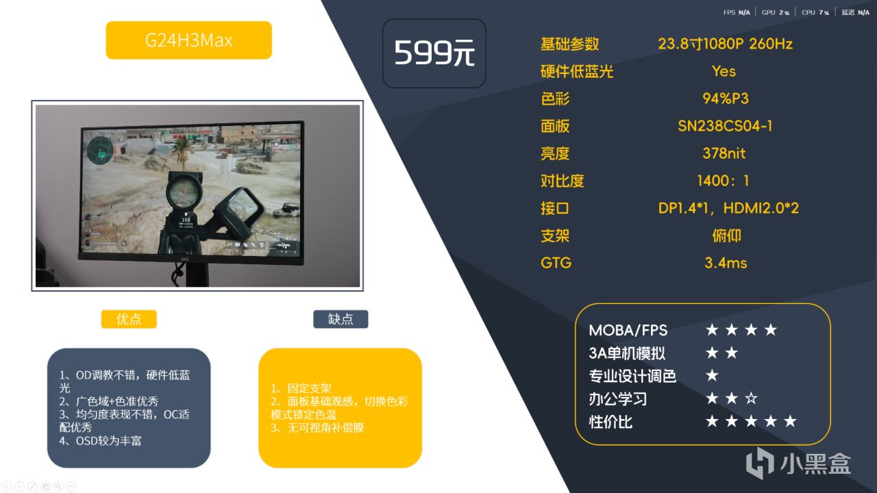 缺點呢,獵鷹模具現在來看有點過時了,塑料感比較重,支架的調節也不順滑,亮度均勻性也比較一般。總的來說,主打性價比,滿足FPS用戶需求的一臺機器。