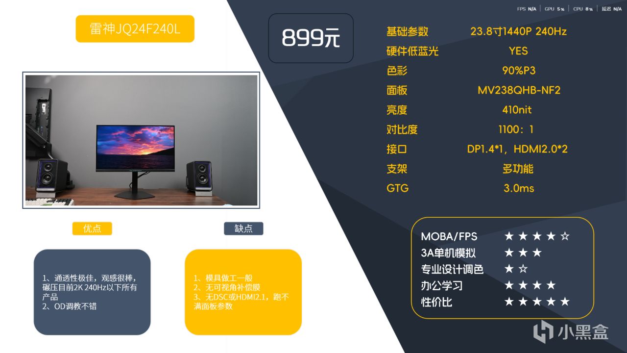 如果你的預算足夠,在雷神首發23.8寸2K 240Hz的JQ24F240L之後,我個人就不再推薦180Hz的產品了。因爲雷神這臺機器的通透性真的很棒,這臺機器最大的優勢就是面板,這塊京東NF2面板可以說是24寸2K 180Hz以及240Hz系列裏面,最棒的通透性,觀感基礎非常好。GTG平均響應時間也能達到3.0ms左右,不錯的FPS屬性,非常適合千元內預算的兄弟們選擇。較好的硬件低藍光用來辦公學習都是可以的。