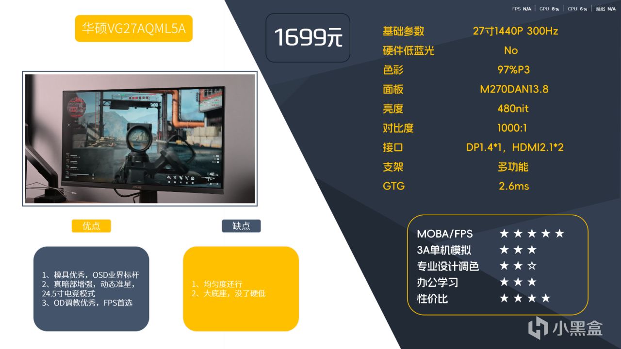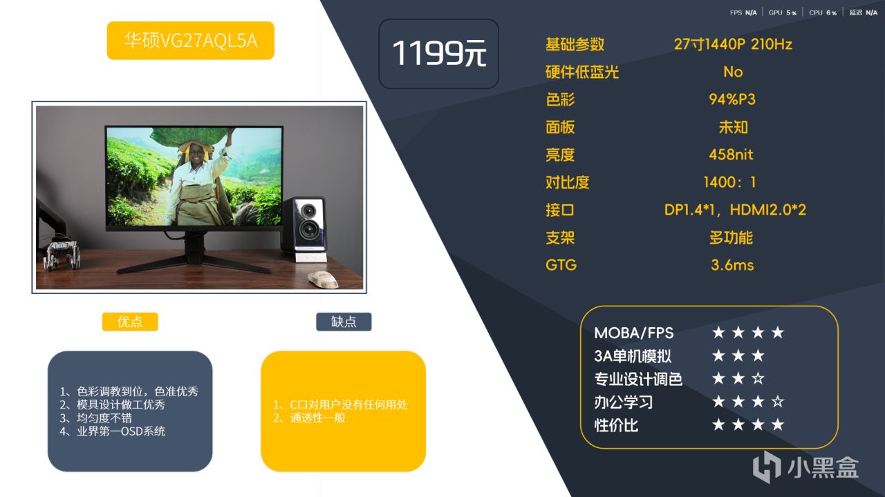 這個參數下,想要更好FPS遊戲性能的,那就直接考慮華碩的新小金剛MAX,VG27AQL5A。對比前代的L3A,這臺機器只有觀感和硬件低藍光表現有點倒退,其他基本是全方位的有提升。首先就是價格上的妥協,前代1499元的日常價,現在價格下降300了,接口上也升級到了滿血的DP1.4,而色彩模式上也終於加入了sRGB和P3,應用面更廣,色準表現一如既往的優秀,對比度超過了1400:1表現優秀。作爲業界最優秀的OSD系統,無需多言。