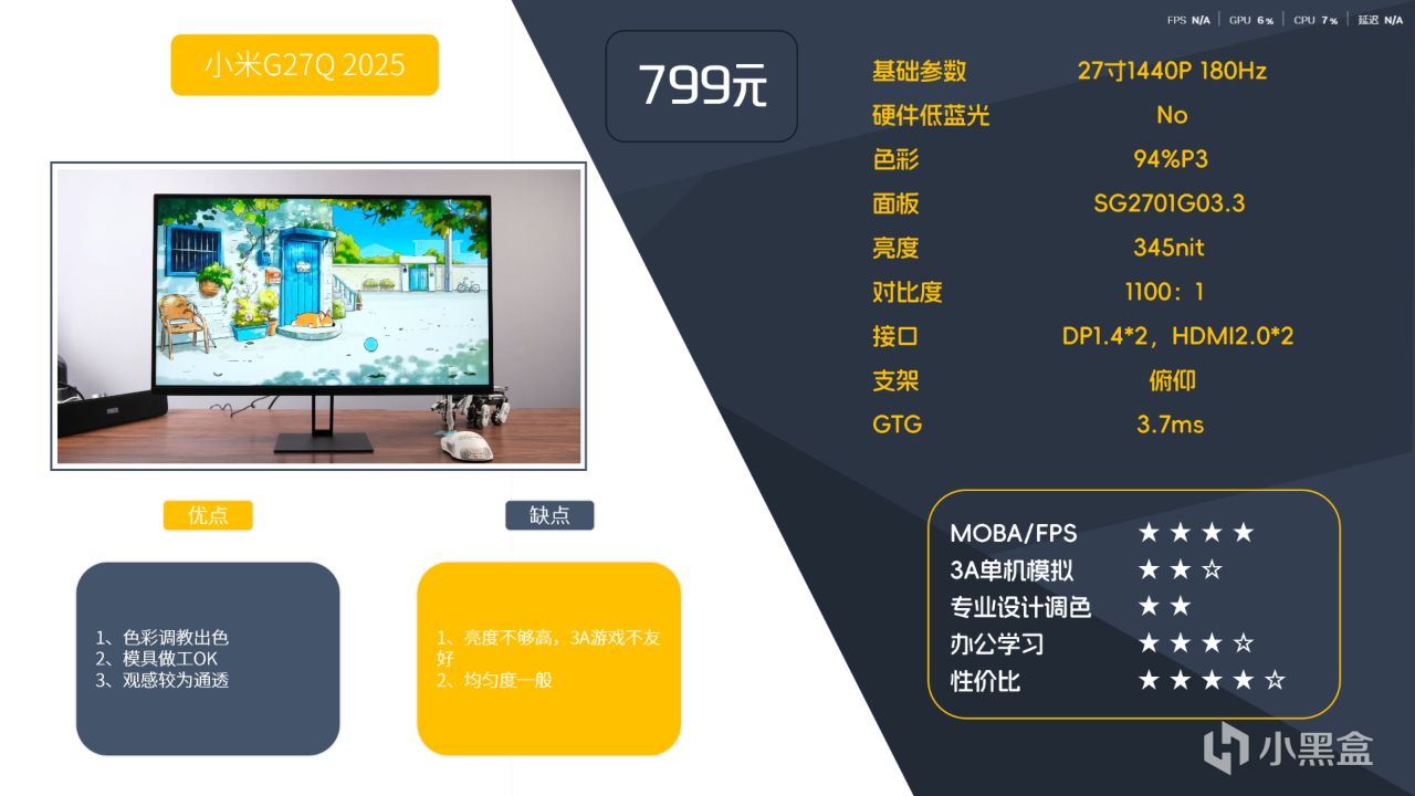 入門2K 180Hz的產品,這裏我主要推薦觀感好一點的產品,首先可以考慮小米G27Q 25款這臺機器,小米這臺機器採用了華星光電面板,整體畫面較爲通透純淨,較高的色溫能讓畫面觀感比較正。色彩調教上,小米也是標杆級別的,模具設計簡約大氣,做工和質感很不錯。是一臺畫面表現力不錯的高刷顯示器。當然他的OSD功能還是有待豐富的,亮度上限不高並不非常適合3A遊戲用戶,適合喜歡小米品牌,喜歡FPS競技遊戲的用戶選擇。