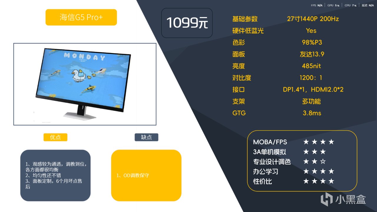 今年200Hz的2K顯示器也全面鋪開了,首先推薦的是售價1099元的海信G5 PRO+,這臺機器也是最近才發佈,面板是海信定製的友達。推薦這臺機器的理由很簡單,不會出錯。這臺機器仍然是千元的全能機,多功能支架,小底座,硬件低藍光,均勻度控制不錯,色彩調教到位,觀感基礎非常不錯。均勻度表現在線。3.8ms的響應時間雖然保守,但是對付正常的遊戲都是沒問題的。