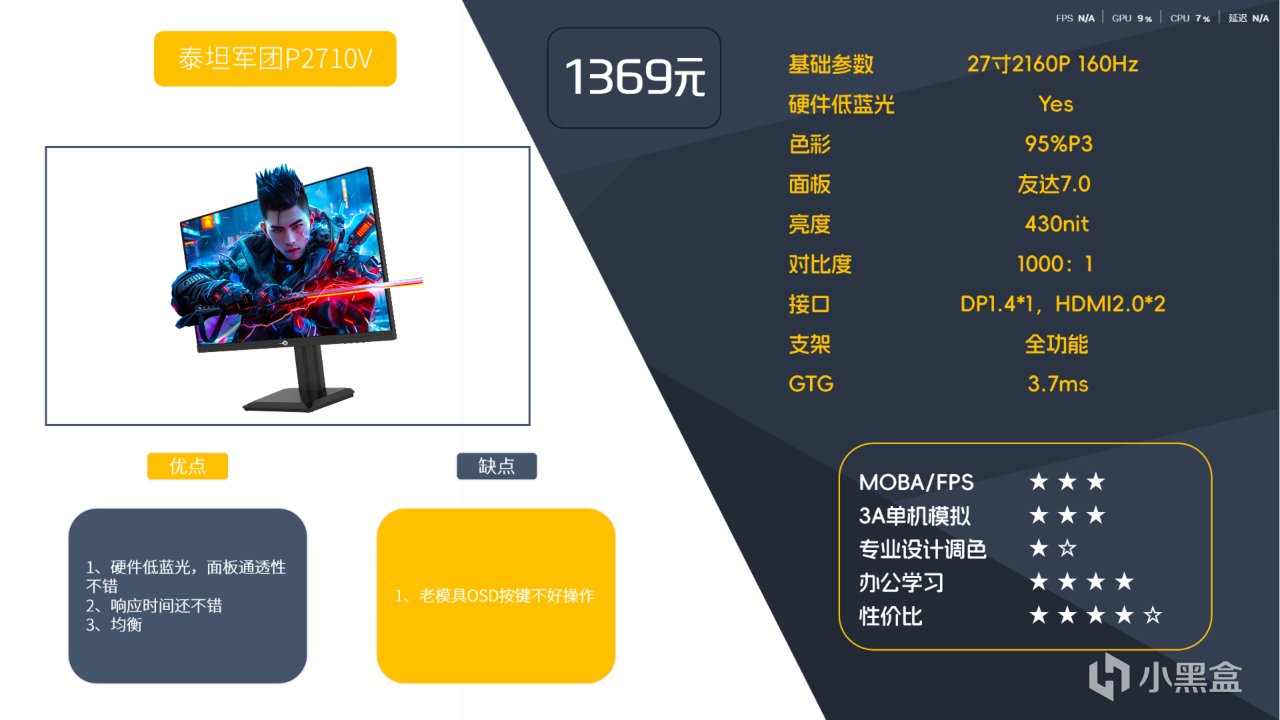 日常只要1300就能拿到,性價比還是不錯的。相對比競品,在保證了色彩和觀感到位的同時,P2710V有着出色的硬件低藍光,多功能支架。並且在色彩調教上,泰坦軍團是相對優秀的,整體機器的把控是很好的,觀感不錯,完全可以看作是一臺4K入門高刷水桶機了。即使不打遊戲,他較爲優秀的觀感和硬件低藍光帶來的護眼表現,用它來兼職辦公都是很好的選擇。他的缺點仍然是泰坦軍團的模具不支持OSD搖桿。