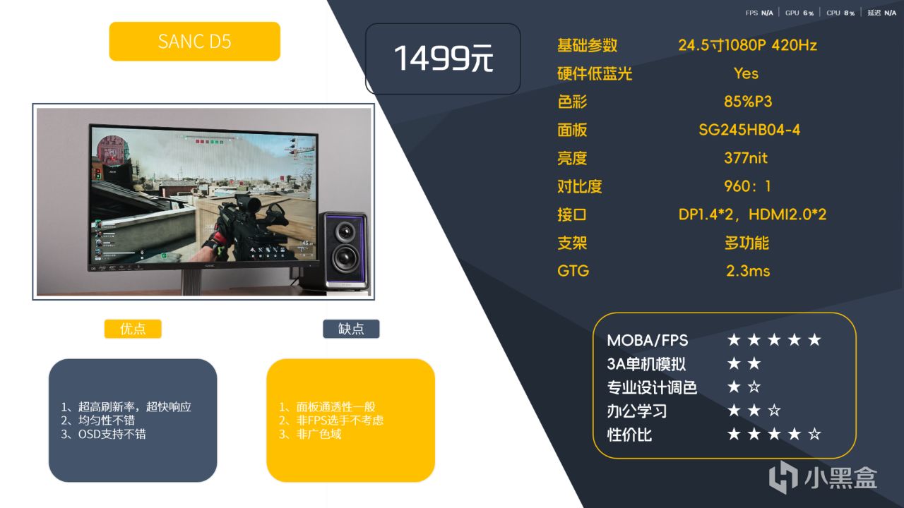它的優點非常明顯,一切只爲電競服務。420Hz的超高刷新率,2.2ms的極致OD調教,配上不錯的遊戲功能支持,還有比較優秀的背光均勻性,SANC D5能保證給到用戶極致的電競支持。對於FPS發燒友,或者對自身的競技表現有更進一步追求的兄弟們,1399元的售價可以說非常良心了。值得推薦。