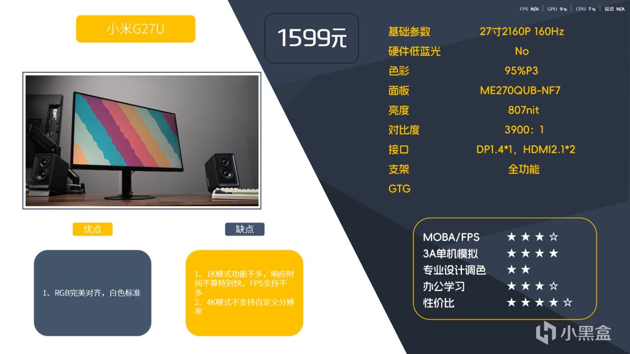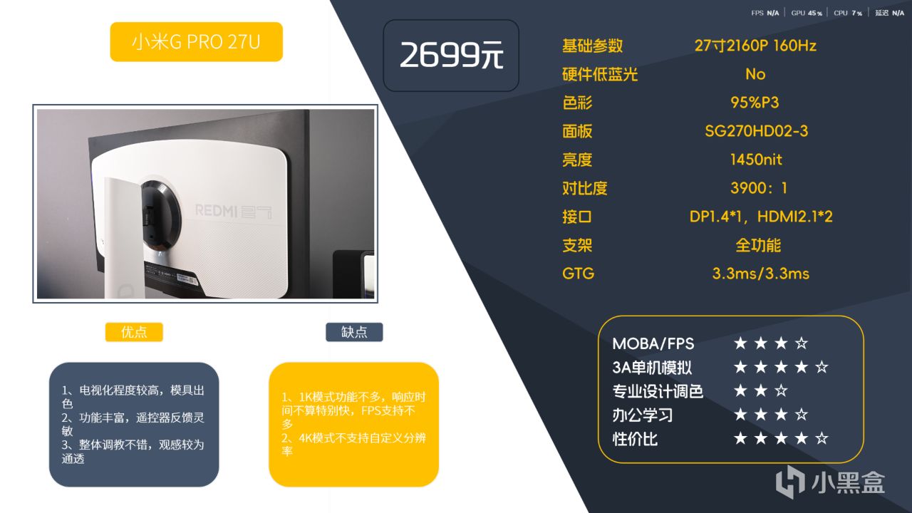 優秀的模具和設計,出色的觀感和畫面調教。很棒的HDR400表現,1K模式超快響應速度。作爲定位入門的4K雙模顯示器來說,小米G27U的功能覆蓋面真的非常廣泛了。日常遊戲,辦公,影音,到理論上來說FPS遊戲,這類需求基本全方位覆蓋。