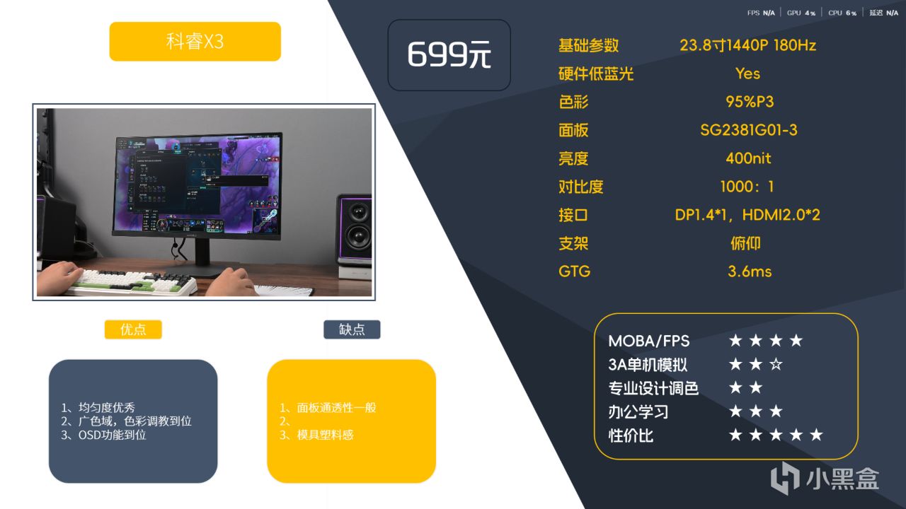 在遊戲支持上,科睿X3的響應時間達到了3.6ms,過沖控制出色,OSD遊戲支持也覆蓋了遊戲準星,暗部增強,DIC動態清晰度加強等主流的功能。所以這臺機器雖然定位入門,卻屬於品質型的機器,699元的價格性價比相當不錯