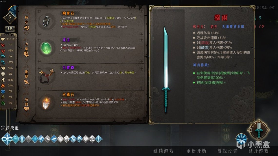 而神兵就是玩家使用的武器,分为多种稀有度,武器的稀有度越高,自带的神兵技能一般就越好,不同的武器的神兵技能不同,往往会与某些圣物或者技能选择产生化学反应。此外,武器的词条是随机刷新的,游戏中救下铁匠后就可以在休整的时候处理武器。圣物则是我们普遍理解的游戏装备,装备也是分稀有度的,高稀的装备会在数值上甚至效果上有更强力的效果。而秘籍就是一些适应这个流派的提升方式,最经典的诸如“走火入魔”就是攻击+300%防御-300%,这些秘籍可以在游戏的推进过程中逐渐获得。