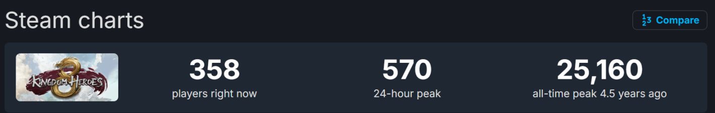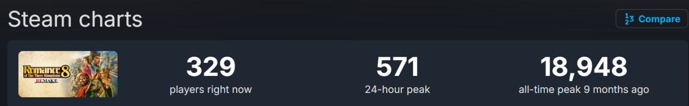 虽然说相较于开服2W人在线的盛况,如今500+的日均在线多少有些萧条——不过反过来说,对这部在就被鉴定为「九转大肠」的作品,竟然还是有着500人在品shit!此情此景,倒是让我想起了另一部跟本作境遇相似的作品:《三国志8 REMAKE》了(好评率48%,目前也是日均500在线)。