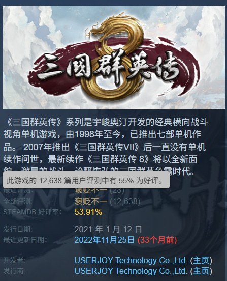 又比如咱们今天要聊的《三国群英传8》——这部凭借着情怀收割了无数国人钱包,但也反过来造成口碑反噬的作品,在Steam上喜提55%好评,将玩家们对系列「童年神作」的滤镜碎了个彻底。(话说回来,是不是叫《三国》的作品都这么带派?)