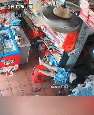 8月3日发布,广东汕尾。一条蛇溜进街边商铺,正在椅子上休息的男子注意到蛇后被吓得惊声尖叫,蛇瞬间也缩头原路折返。