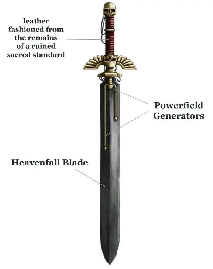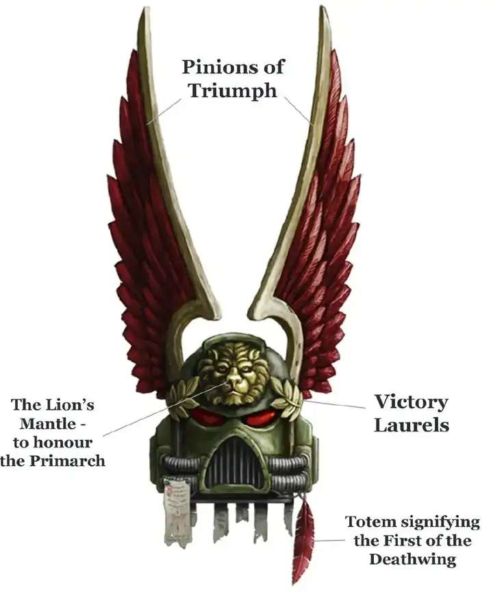 新任者将被授予战团两件最神圣的圣物作为权柄象征—狮盔(一件据说曾由暗黑天使原体莱恩·艾尔庄森佩戴的强大遗物,但我觉的不大可能。原体脑袋比阿斯塔特大多了)与秘密之剑(暗黑天使天陨之刃中最尊贵之剑,这些武器皆由大叛乱后撞击暗黑天使移动修道要塞"巨石"的陨石锻造而成)。这柄古老兵刃的工艺如此精湛,其锋刃历经千万年岁月仍无缺无损。阿兹瑞尔还接过了"雄狮之怒"—据传由技术贤者"无可匹敌的普雷斯托"在卡利班陨落时期打造的复合型等离子枪。最后他披上名为"守护者"的精工动力甲,其上镶嵌着象征至高大导师的徽记。