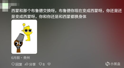 在国内,这样的现象也在发生。并且,由于Sprunki没有一个足够广为人知的通用译名,它便彻底与节奏盒子混淆,成为“节奏盒子”。在游戏领域,这与外网早期发生的事相同,也有不少人倒反天罡,认为Sprunki才是原版,Incredibox则是名为“大叔版”的改版;而在角色形象领域,更是将Sprunki动画称作“节奏盒子动画”,哪怕一点游戏要素也没出现。